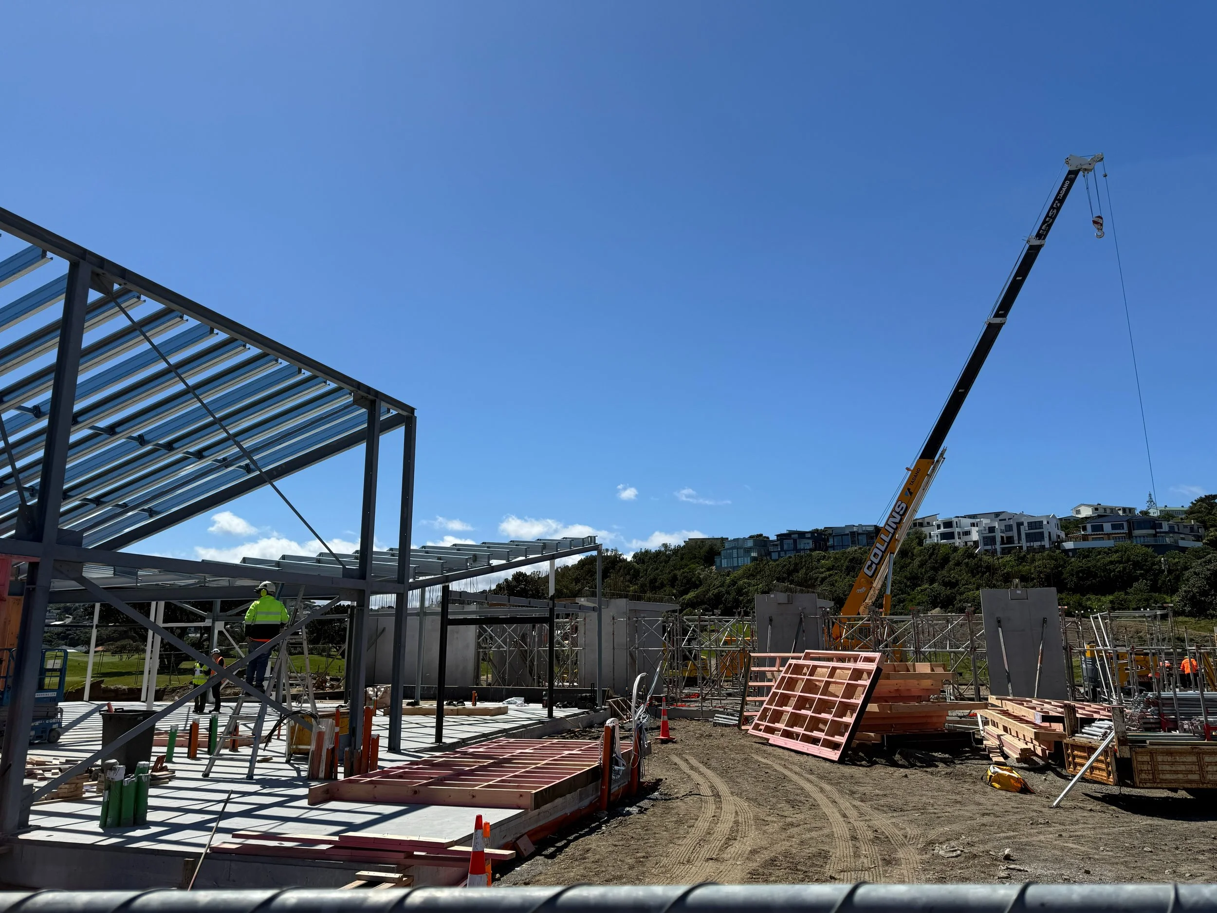 Alongside the clubhouse build, the driving range is quickly becoming the standout feature of the redevelopment. The final precast wall panels are now installed and crane lifts have been successfully completed, creating the skeletal form of what will be Wellington city’s first-ever driving range.