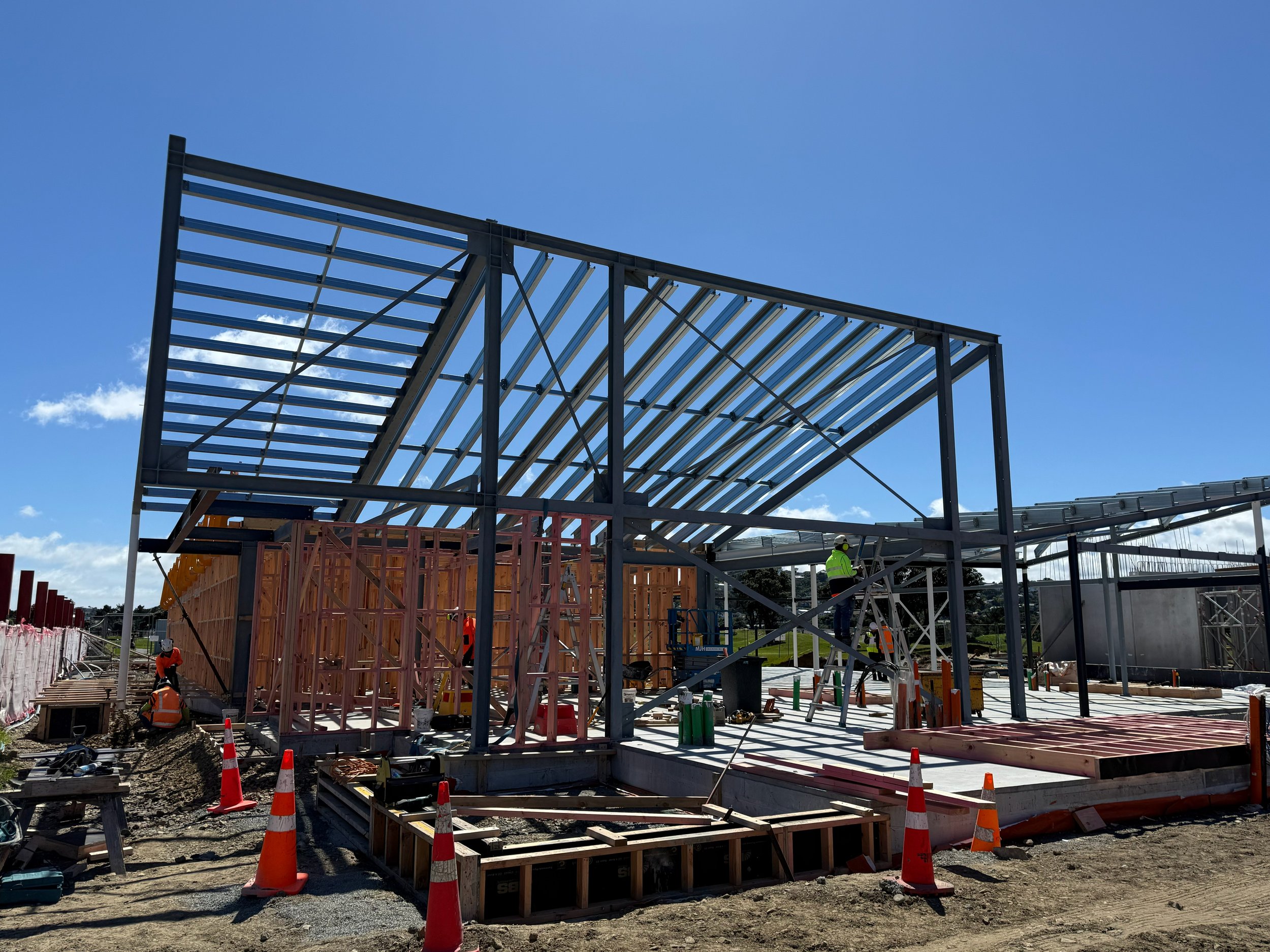 As for the lounge - with structural steel complete and framing nearly done we will be cracking into the roof - including ply, facias, skylights, followed by the warm roof system. The north end pergola will be going up this month along with completion of the main entry way ramp.